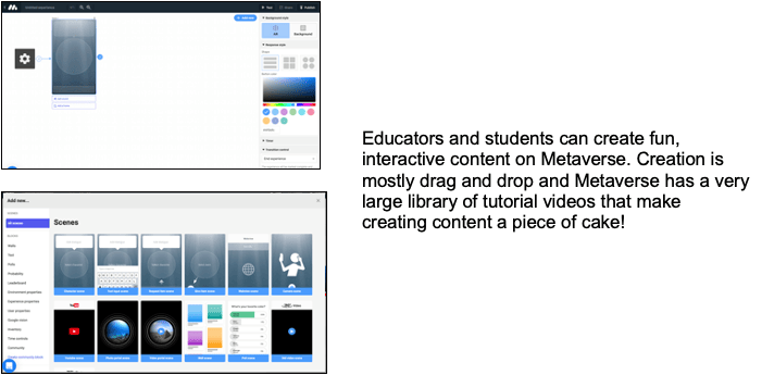 Getting started with this tool has more of a time investment upfront to get it set up, but Metaverse has an amazing YouTube channel that allows educators and students to quickly learn how to use the many creation assets and tools available.