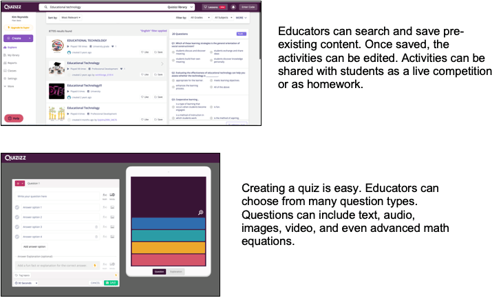 Quizizz is a website and app that allows educators to find or create interactive presentations and game-based assessments. Similar in structure to trivia games that have been popular in restaurants for the last 20 years, Quizizz allows students to demonstrate learning while competing against classmates.