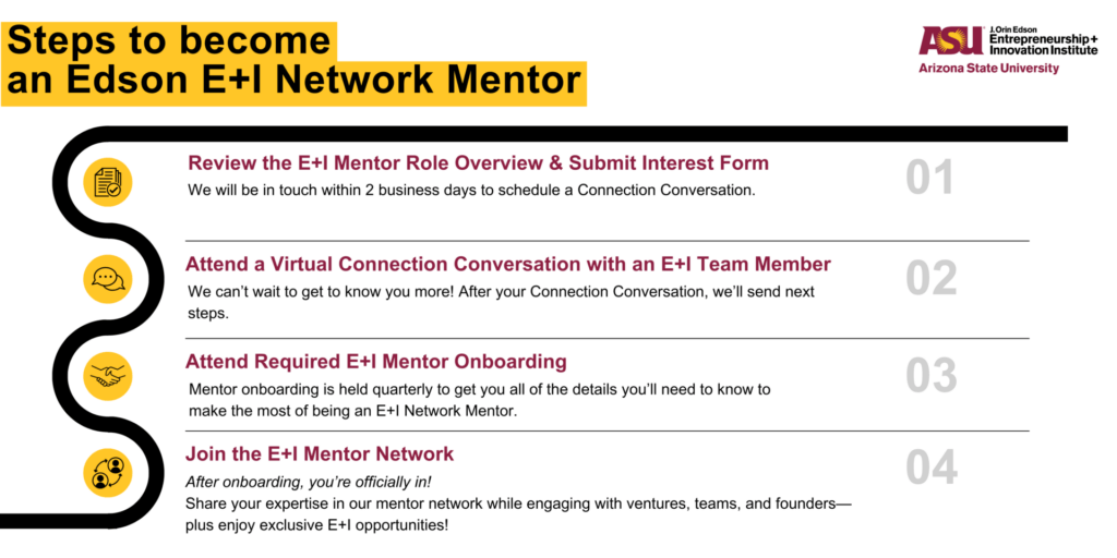 No matter where you are on your entrepreneurial journey—whether you’re an ASU student, faculty, alum, or community member—Edson E+I Mentors are here to help you grow. Join our online E+I Community and explore the E+I Mentor Hub to find the right mentor and schedule a meeting today.